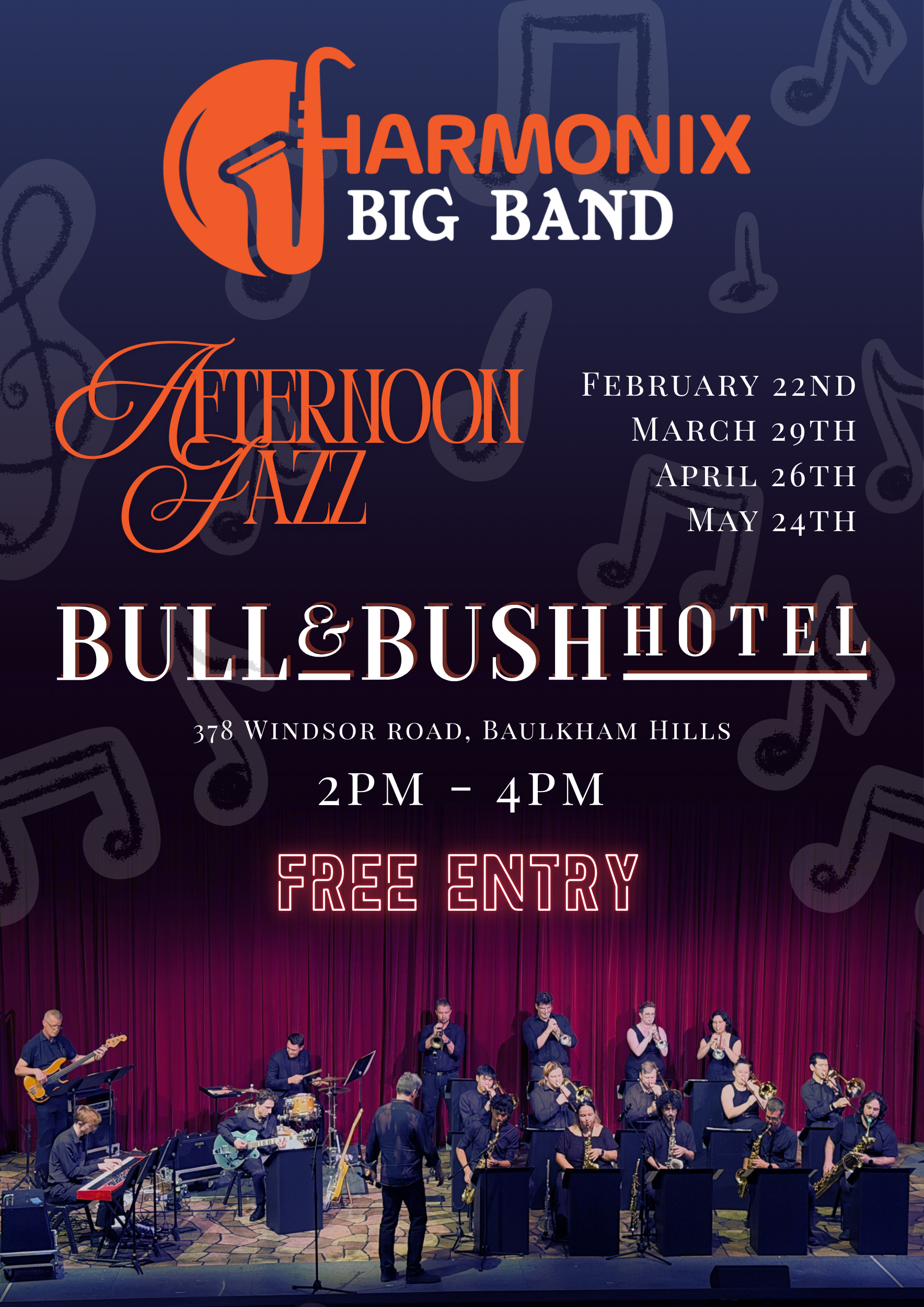 Harmonix Big Band is proud to present a 4 month residency at the Bull and Bush Hotel in Baulkham Hills. Join us for an afternoon of swingin’ tunes that’ll make you want to get up and dance.